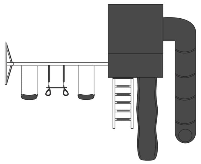 New in 2023, the Kingdom Lodge is a fresh new take on an enclosed play space for your kids, featuring a clean, modern design aesthetic that’s sure to please. This vinyl playset includes a 6’x9′ Kingdom Lodge Tower with 7′ Landing, with a 6’x6′ enclosure, 3’x6′ porch, poly lumber walls, black roof and 5′ high deck. An optional entry door with handle is shown as well. Exiting the inside of the tower is a 7′ Sidewinder slide with two clear sections. Extending from the front porch is a 10’ Avalanche slide, step ladder with access railing, and 3-position single beam swing attachment with two belt swings and a trapeze.